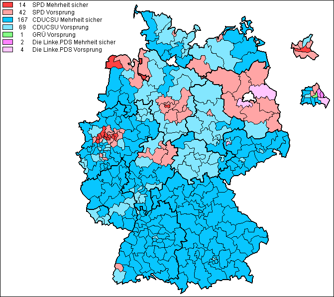 Wahlkreisprognose Stand 16.07.2005Die Wahlkreisprognose auf der Basis der Wahlergebnisse 2002 und der aktuellen Umfragedaten ergibt folgendes Bild: Die SPD könnte 56 Wahlkreise gewinnen, CDU/CSU kämen auf 236, die GRÜNEN auf einen und die PDS auf sechs Wahlkreise. Insgesamt gibt es 116 umkämpfte Wahlkreise mit knappen Mehrheiten. Gegenüber der Vorwoche hat die SPD sieben Wahlkreise von der CDU hinzugewonnen.Wie funktioniert die Prognose und wo gibt es Daten für einzelne Wahlkreise?