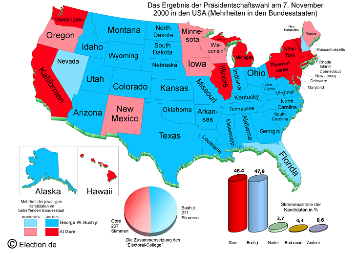 Das absolute Chaos jedoch verursachten die Fernsehsender, die ihre Pi-mal-Daumen Schätzungen als Endergebnisse in Bundesstaaten bekannt gaben, in denen gleichzeitig noch gewählt wurde. Sie vernachlässigten zunächst die Republikaner-Hochburgen in West-Florida und erklärten Gore voreilig zum Sieger, nur um Stunden später Bush auf den Schild zu heben. Schliesslich war dort das Ergebnis so knapp, dass eine Neuauszählung aller Stimmen angeordnet wurde. Historisches Vorbild ist dabei offenbar Niedersachsen, von manchen auch das Florida des Nordens genannt. Hier ging es bei der Landtagswahl 1974 ebenso knapp zu. Erst nach 8 Monaten stand das Ergebnis fest und ein SPD-Abgeordneter musste nachträglich seinen Sitz räumen. Die verbliebene Ein-Sitz-Mehrheit brachte der SPD/FDP-Regierung übrigens kein Glück. Sie hielt nur ein Jahr, bis schliesslich mit Hilfe unbekannter Überläufer im Landtag der CDU-Kandidat Ernst Albrecht doch noch zum Ministerpräsidenten gewählt wurde. |