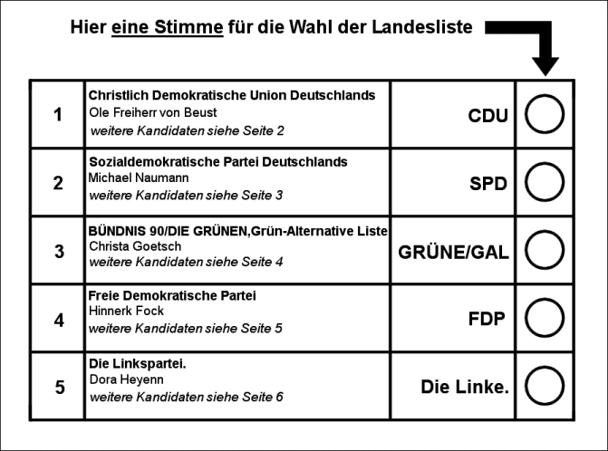 Das neue Hamburger WahlsystemÄhnlich der Zweitstimme bei Bundestagswahlen können sich die Wähler für eine der Landeslisten entscheiden. Auf die Reihenfolge der Kandidaten gibt es keinen Einfluss, diese wird bei der Aufstellung durch die Parteien vorgegeben. Die Verteilung aller 121 Sitze - und damit die Stärke der Parteien in der Bürgerschaft - entscheidet sich nach diesen Listenstimmen. |