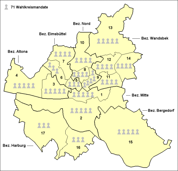 Das neue Hamburger WahlsystemDie Stadt ist in 17 Wahlkreise eingeteilt, in denen eine feststehende Zahl zwischen drei und fünf Mandaten zu vergeben ist. Insgesamt werden 71 Wahlkreismandate gewählt, ergänzt um 50 Abgeordnete von den Landeslisten. Die Stärkeverhältnisse der Parteien in Hamburg insgesamt richtet sich ähnlich wie bei der Bundestagswahl nach den Listenstimmen. Die Wahlkreisstimmen sind vor allem für die einzelnen Kandidaten vor Ort von Bedeutung. |