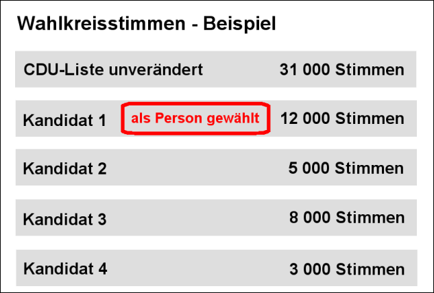 Das neue Hamburger WahlsystemJe ein Sitz ist im Beispiel nach Personenstimmen und nach der Liste zu vergeben. Dabei ist die Reihenfolge wichtig, denn es ist möglich, dass ein Kandidat in beiden Kategorien einen Sitz erhalten würde. Im ersten Schritt wird der Kandidat mit den meisten Personenstimmen ermittelt. Dies ist hier der Kandidat, der auch auf Platz eins der Liste steht. Er erhält einen Sitz. |