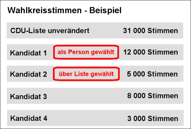 Das neue Hamburger WahlsystemIm zweiten Schritt wird der Sitz nach Listenreihenfolge vergeben. Da der Kandiat auf dem ersten Listenplatz bereits einen Sitz aufgrund der Personenstimmen erhalten hat, kommt nun der Kandidat auf Listenplatz zwei zum Zuge. Alle weiteren Kandidaten werden nicht mehr berücksichtigt, da die CDU insgesamt nur zwei Sitze in diesem Wahlkreis erhalten hat. |